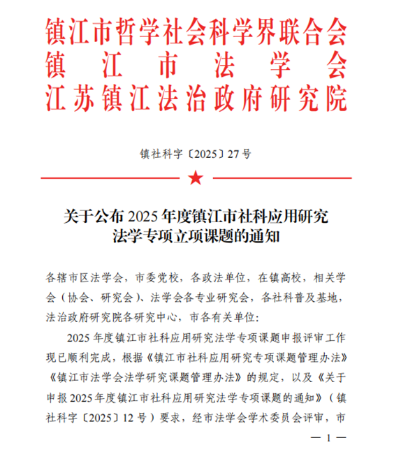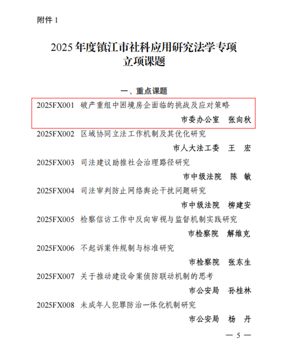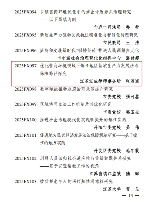 2025年6月17日,镇江市哲学社会科学界联合会、镇江市法学会及江苏镇江法治政府研究院公布了2025年度镇江市社科应用研究法学专项立项课题名单,我所两项课题榜上有名! 由市委办公室张向秋主任负责,我所黄友定主任、张茂诚副主任、董玉荣、纪从政律师参与的《破产重组中困境房企面临的挑战及应对策略》课题被列为重点课题。由张茂诚副主任负责,破产团队蒋森林、易长川、纪从政、王海嘉、陆文优、王春梅参与的《优化营商环境视域下镇江地区新质生产力发展法治保障路径探究》被列为自选课题。 我所将坚持以习近平新时代中国特色社会主义思想为指导,深入贯彻落实习近平法治思想和总体国家安全观,全面贯彻党的二十大和二十届二中、三中全会精神,坚持理论联系实际,大力繁荣法学研究、服务法治实践,按时高质量完成课题任务,为中国式现代化镇江新实践贡献更多的法治力量!