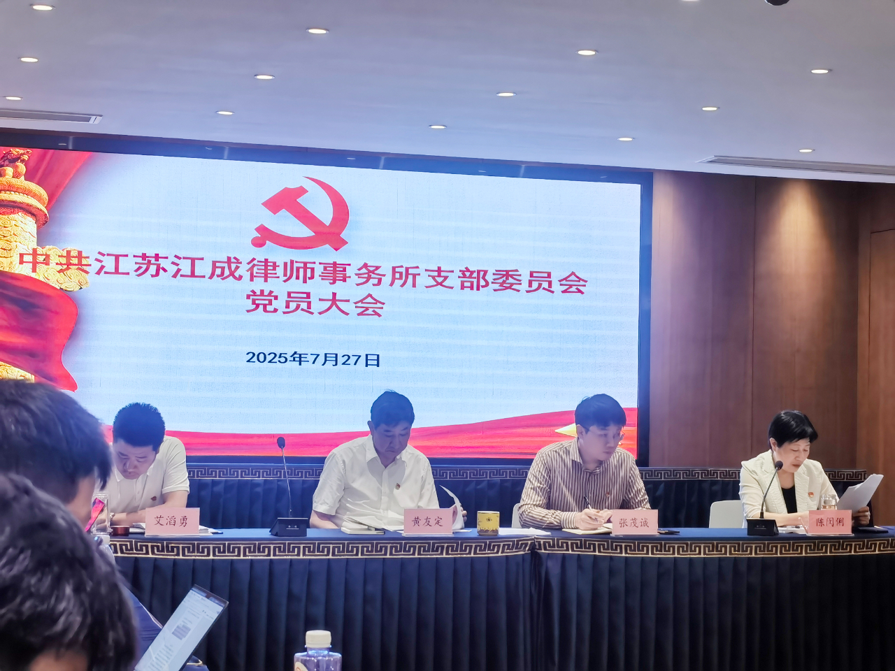 2025年7月27日,江苏江成律师事务所党支部召开党员大会。党支部专职副书记陈闵俐主持会议。 首先,推荐入党积极分子。各位党员同志秉持公正、客观的态度,为党组织推荐优秀的后备力量。 在培养联系人介绍入党积极分子推荐对象的有关情况后,到会的党员对推荐对象进行无记名投票推荐。 接着,党支部书记张茂诚同志为大家进行警示教育。 警示教育是我们强化纪律意识、筑牢思想防线的重要举措。通过对典型案例的剖析,从中吸取教训,时刻保持警醒,做到心有所畏、言有所戒、行有所止 ,严守党纪国法和职业操守,将纪律和规矩内化于心、外化于行。 会议的第三项议程是观看微党课视频。通过学习,进一步增强党性、坚定信念、不忘初心、牢记使命。 最后,黄友定主任讲话,黄主任作为有40年党龄的老党员,结合自身经历分享了感悟与要求:1、党员初心与担当:党员称号一直鼓励自己坚毅前行,党员律师要时刻牢记入党誓言,做到走在前、冲在前;2、 团结与方向:强调江成律师事务所党员律师占三分之一,大家要团结一心,引领每位律师沿着党的路线方针前进,同时要做遵纪守法的模范;3、支部建设要求:提出作为五星党支部要更加严格加强规范化建设与管理;4、行业自律与党性提升:指出律师行业要求严格,律师作为法律共同体,要依照法律规范自身行为,党员律师要不断增强党性,更加努力前行。 会后,党员同志们表示,在今后的工作和生活中,要牢记党员身份,严守纪律规矩,积极发挥先锋模范作用,为江苏江成律师事务所的发展,为法治社会的建设贡献更多的力量。