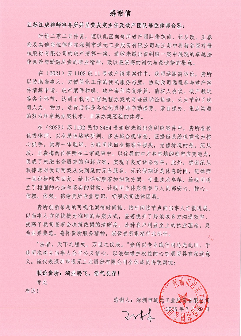 “法者,天下之程式,万世之仪表。”这句古训,在我所破产团队办理的江苏中科智谷医疗器械有限公司破产清算案中得到了生动诠释。2025年8月,一封来自债权人的感谢信,如同一束温暖的阳光,照亮了破产团队每一位成员的心房。 信中,债权人对我所破产团队表达了衷心的感谢,称赞他们在案件办理过程中展现出的专业与担当。 “无产可破”的绝境 江苏中科智谷医疗器械有限公司,这家曾专注于注输、 护理和防护器械制造的企业,因经营不善,陷入了无法偿还到期债务、资产不足以清偿全部债务的绝境。2021年9月,债权人向法院申请将其执行案件移送破产审查,一场充满挑战与未知的破产清算大幕就此拉开。 一波三折,困境重重 2021年10月,镇江市中院正式裁定受理中科智谷公司的破产清算申请,并于同年11月指定我所为管理人。面对这家名下无车辆、无房产,一家“无产可破”的企业,管理人团队深知前路艰难,但团队并未退缩,而是迎难而上,经过不懈努力,终于促使中科智谷公司与债权人达成和解,案件进入破产和解程序。 然而,和解之路并非坦途。和解协议部分履行后,中科智谷公司却以名下无任何资金为由,拒绝继续履行。无奈之下,债权人再次申请将其推入破产清算程序。此时,如何在这片“无产”的荒漠中寻找到财产线索,制定出让债权人、债务人都能接受,且能有效保障各方利益的财产变价与分配方案,成为摆在管理人面前的首要难题。 破局关键,智慧与勇气并存 面对重重困境,管理人团队没有放弃,而是深入挖掘案件细节,终于找到了破局的关键点——股东未实缴出资。中科智谷公司章程中明确规定,股东应在2025年12月31日前足额缴纳注册资本,但截至破产申请受理时,实缴资本竟为0元。这意味着,在公司已进入破产程序的情况下,股东的出资期限利益不再受到保护,出资期限加速到期,股东需立即补足出资。 管理人团队迅速抓住这一关键点,立即向京口法院提起追收股东未缴出资的诉讼。经过京口法院、镇江中院审理,最终支持了管理人的诉讼请求。这一场智慧与勇气的较量,让原本“无产可破”的案件迎来了转机。 勤勉尽责,彰显担当 通过追缴出资,中科智谷公司破产清算案最终实现了各类债权的100%清偿,债权人的合法权益得到了充分保障。这一复杂破产案件的成功办理,不仅彰显了我所破产团队卓越的攻坚能力,更是我所整体实力与价值追求的集中展现。 管理人团队以勤勉尽责的态度,展现了专业律师在化解社会矛盾、维护经济秩序诚信基石中的关键作用,他们精益求精,不仅是对个案公正的坚守,更是对法治精神确定性的一次次有力宣示。 我所破产团队将以此次债权人的肯定为新起点,持续强化专业协同能力,深化服务品质,恪守执业准则。他们深知,“破产保护不是终点,而是市场主体信用重建的起点”。未来,他们将继续用专业和智慧,书写更多从“绝境”到 “奇迹”的辉煌篇章!